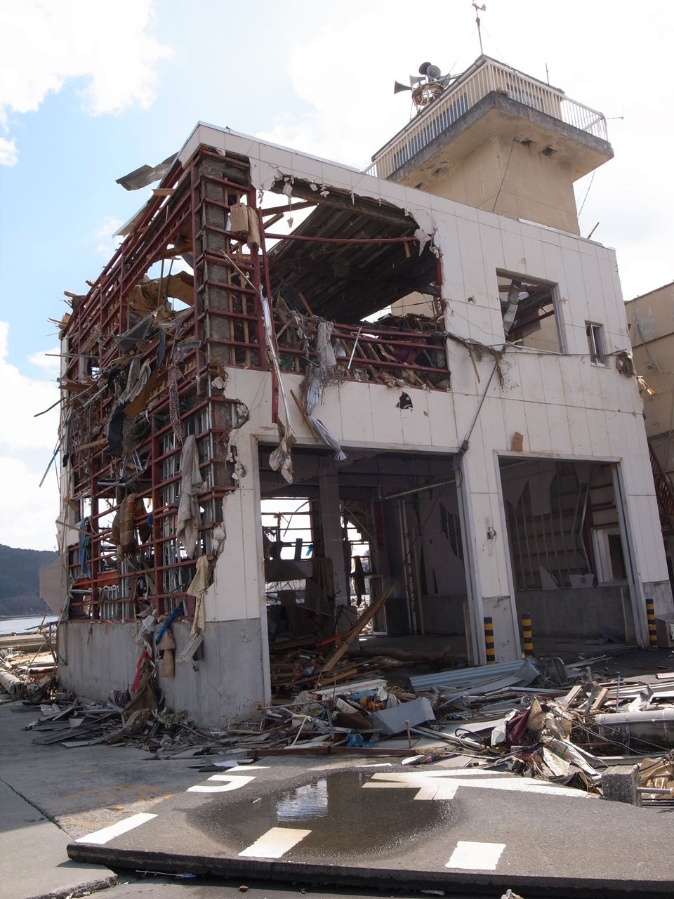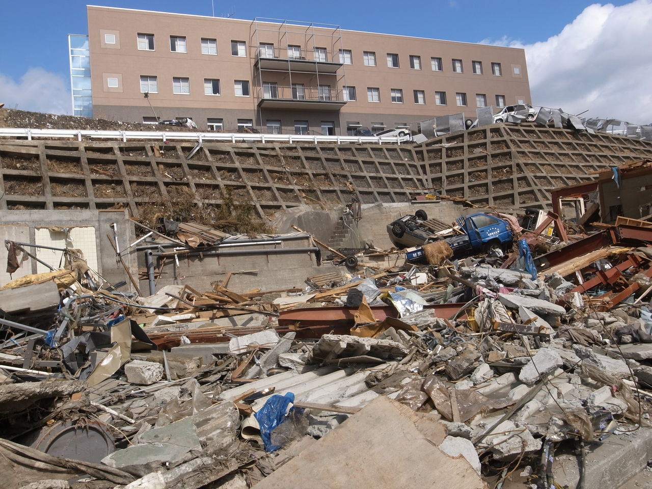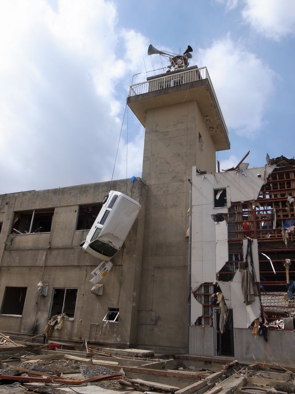 倒壊した鉄筋のビルは、突き刺さった車とともに放置されている=同町