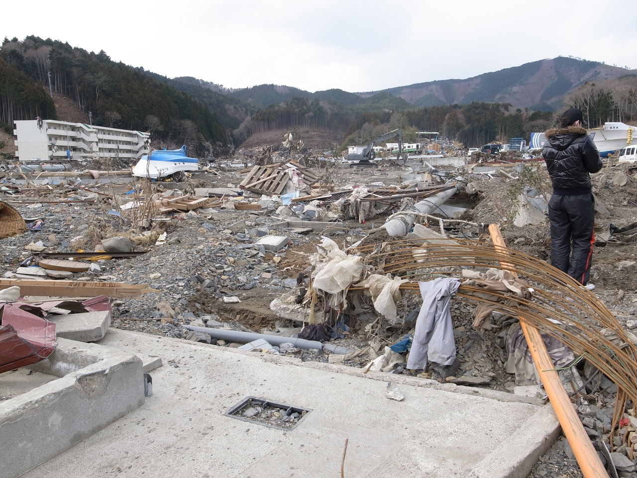 道の駅「高田松原」付近。観光ホテルの取り壊し作業が続く=岩手県陸前高田市