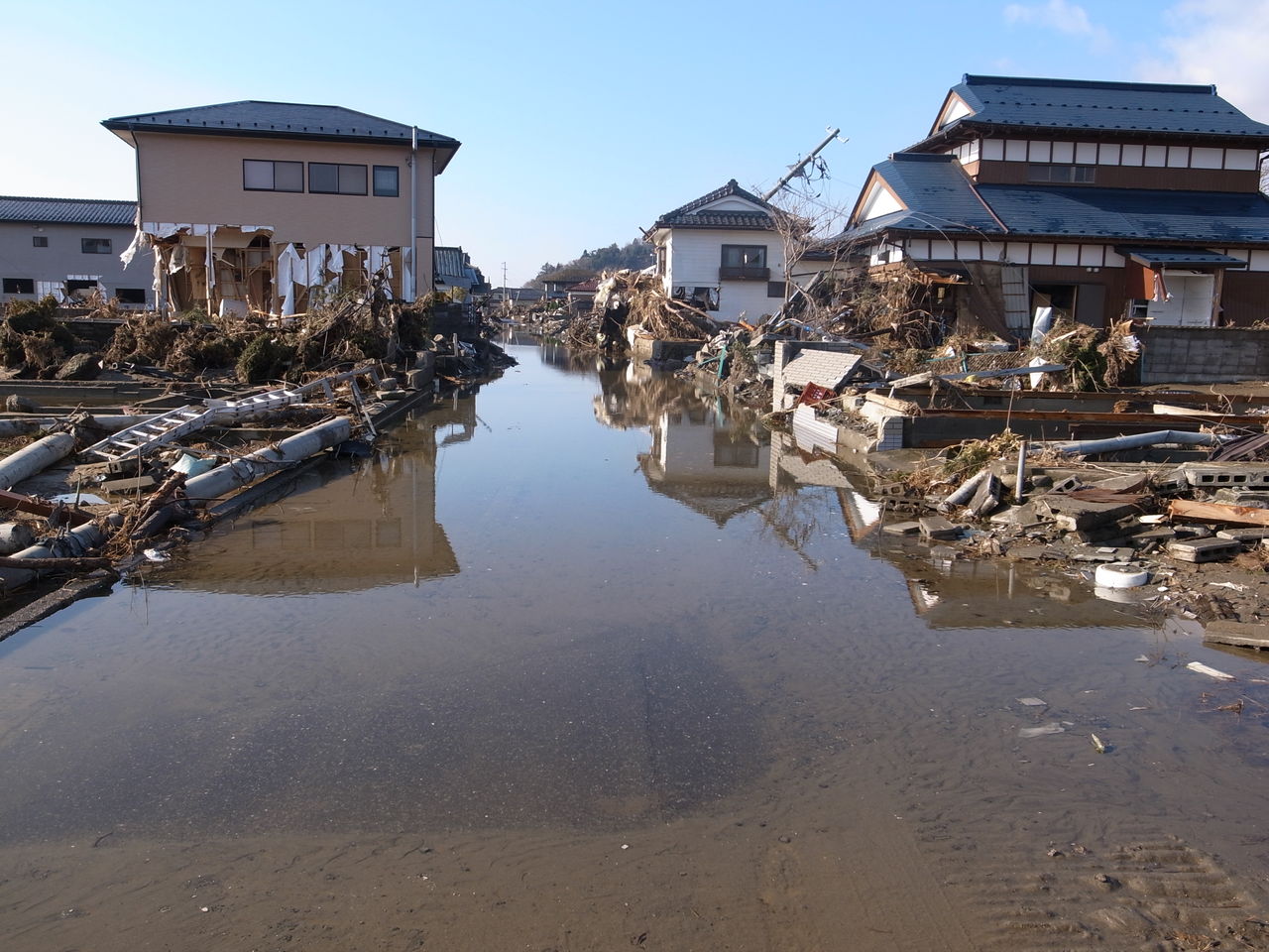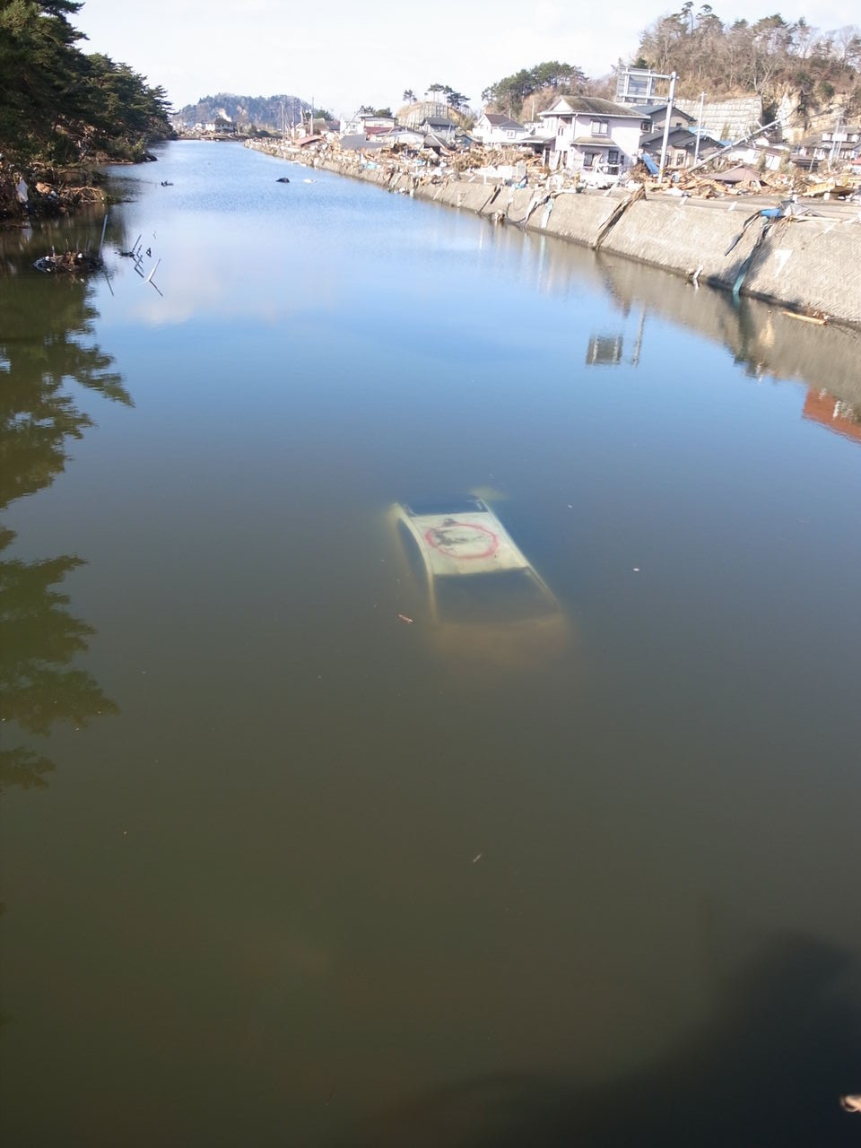 震災直後には流された家や車が沈んでいた運河。橋は補修されていない=同市野蒜地区